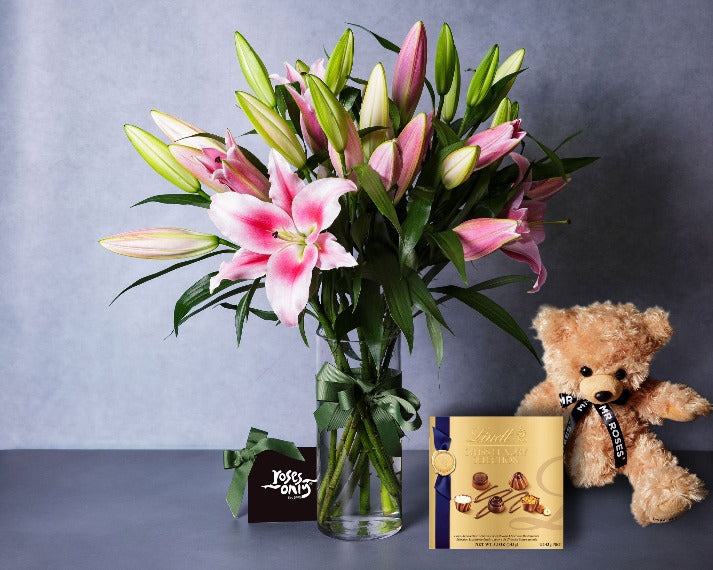Mother's Day Flowers - Pink Lilies, Pink Roses & Gourmet Chocolate Truffles