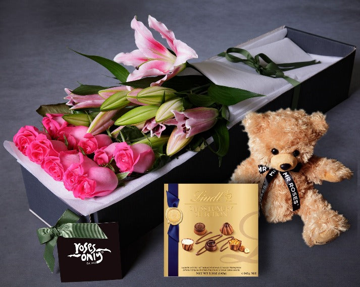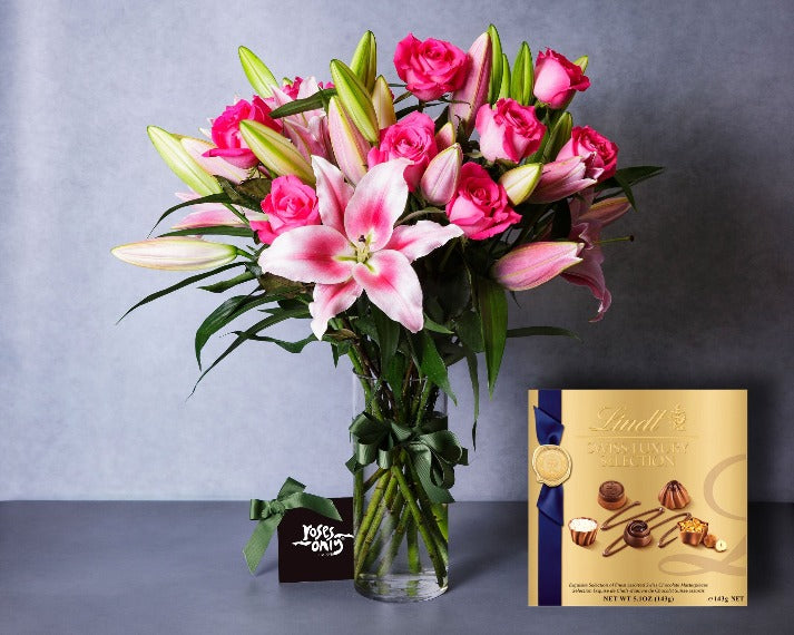 Mother's Day Flowers - Pink Lilies, Pink Roses & Swiss Luxury Chocolates
